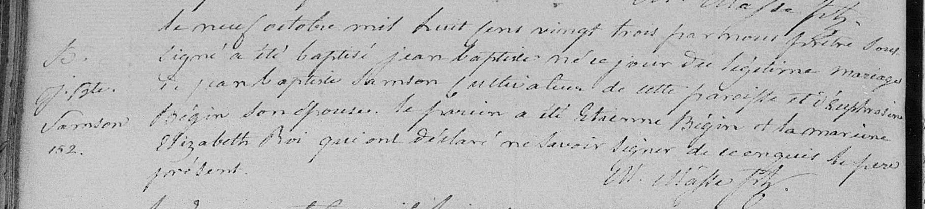 Le neuf octobre mil huit cens vingt trois par nous prêtre sous signé a été baptisé jean baptiste né ce jour du légitime mariage de jean baptiste Samson cultivateur de cette paroisse et d’Euphrosine Bégin son épouse. Le parrain a été Étienne Bégin et la marraine Élizabeth Roi qui ont déclaré ne savoir signer…