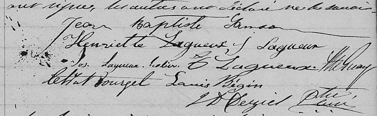 Le huit juillet mil huit cent quarante-cinq, après la publication d’un ban de mariage faite au prône de notre église paroissiale entre Jean Baptiste Samson, aubergiste, résidant en cette paroisse, fils majeur de Jean-Baptiste Samson et de Euphrosine Bégin ses pères de cette paroisse d’une part, et Henriette Lagueux résidente en cette paroisse, fille majeure de Joseph Lagueux, cultivateur et Angèle Samson, ses père et mère aussi de cette paroisse, d’autre part, ne s’étant découvert à ce mariage d’autres empêchements que celui du troisième degré de consanguinité d’un côté et du quatrième de l’autre dont les parties ont obtenu dispense ainsi que de deux autres bans de publication par lettre de monseigneur l’évêque de… en date du quatre du présent, nous prêtre soussigné de cette paroisse avons reçu leur mutuel consentement de mariage et leur avons donné la bénédiction nuptiale en présence de Jean-Baptiste Samson père de l’époux, de Joseph Lagueux, père de l’épouse et d’autres personnes et amis dans ??? lesquels ont signé, les autres ont déclarés ne le savoir.