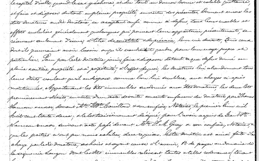 C’est presque leur testament, car ils donnent tout à Charles. Entre autres, une somme de 83 Louis, 6 chelins et 8 deniers qui représente le capital d’une rente annuelle de 5 Louis que le marchand John Guilmour doit payer comme loyer pour une portion de lot attenant au fleuve (que Charles résiliera en 1869). Ils donnent aussi tous leurs meubles et effets mobiliers, mais se réservent à titre de constitut et de précaire, toute leur vie durant, ceux dont ils pourraient avoir besoin ou qu’ils voudraient garder pour leur usage propre ; en clair, ils ont accès à tous leurs biens, mais n’en sont plus propriétaires. Mais Charles a des obligations : les loger, chauffer, éclairer, nourrir, vêtir, soigner comme lui d’une manière convenable tant et aussi longtemps qu’ils s’accorderont bien ensemble ; il devra aussi soigner les donateurs tant en santé qu’en maladie, quérir le médecin, en payer les frais, appeler le curé au besoin ; les mener partout où ils le désireraient et les ramener ; leur payer annuellement une somme de 12 Louis et 10 chelins comme supplément de rente et de pension. Le pauvre Charles devra aussi entretenir proprement, convenablement et bien chauffer le logement des donateurs ; il devra entretenir leur lit proprement, de draps et couvertes, leur table de nappes. Bref, en prendre soin.