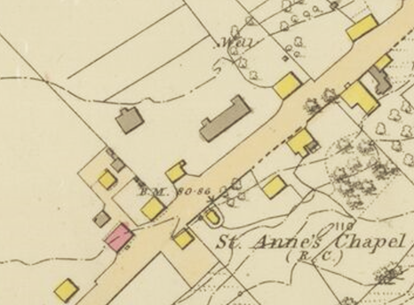 Sur l’agrandissement de cette carte plus bas, on voit la chapelle Sainte-Anne qui aide à nous situer. La maison en jaune qui lui fait face est celle qui a précédé notre maison du 227 Saint-Joseph, car elle ne semble pas sur la ligne de terrain, ou bien c’est une partie de notre ancienne maison. Pour ceux qui se souviennent, dans la cave, il y avait une fondation bizarre sur le côté ouest, provenant peut-être de cette bâtisse. La rue Sainte-Catherine, qui s’est appelée rue Samson pendant un certain temps, n’est pas encore tracée.