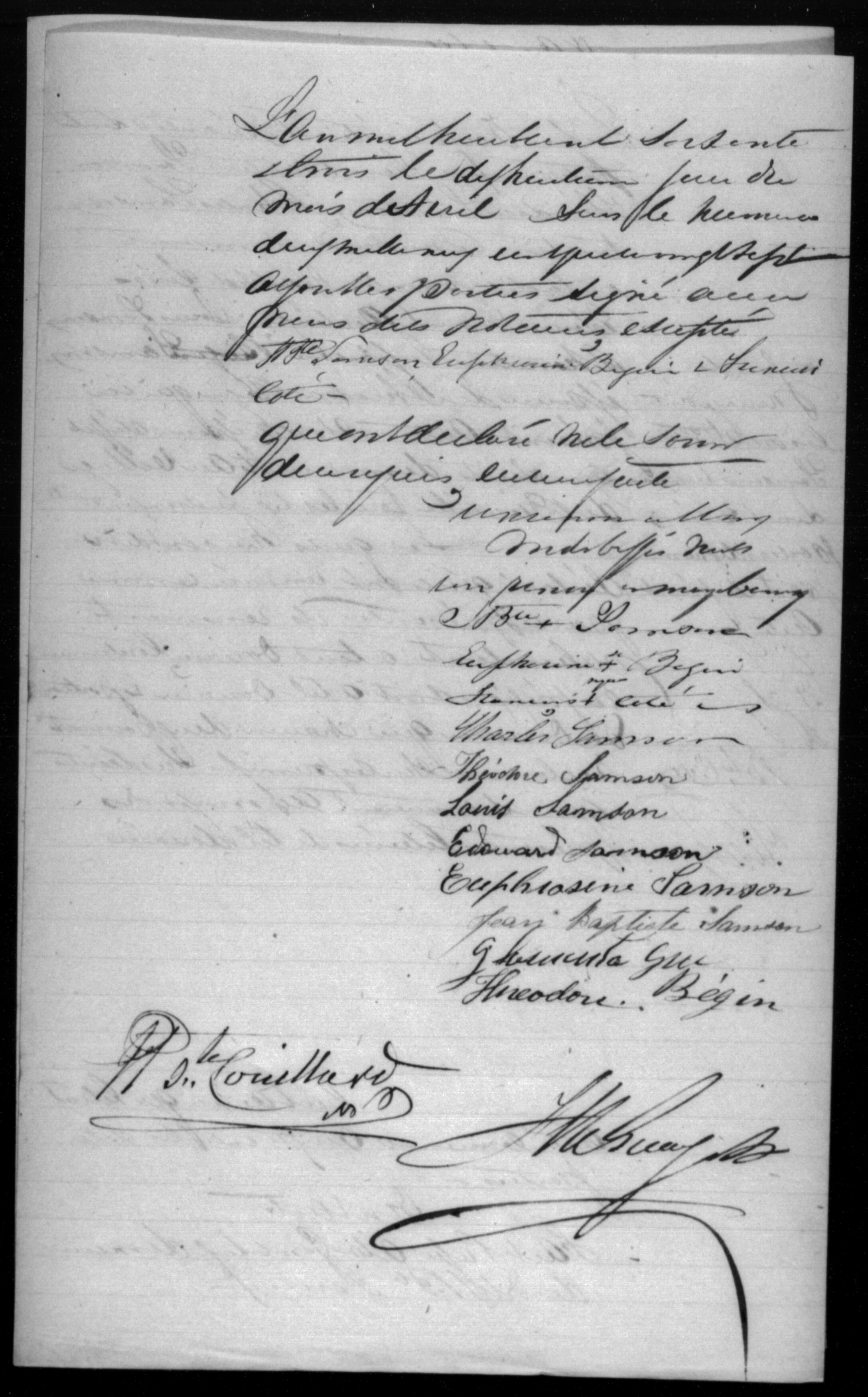 15 January 1862… at the suit of Pierre Lecours Barras, of the parish of ND de la Victoire, navigator against the lands and tenants (?) of Theodore Bégin and Edouard Samson, both navigators, residing in the parish of ND de la Victoire, and JB Samson of Pointe Lévy, merchant… I, the said sheriff, did proceed to the sale and adjudication of the herein after described property as belonging to the said Jean-Baptiste Samson, to which a land situated in the parish of St-Joseph of pointe Lévi, first range, containing one arpent and a half in front by forty arpents in depth, joining toward the north to the top of the hill, and towards the south to the end of the said depth, on one side towards the north east to Amable Samson and to the other side toward the south west to Pierre Bégin with the buildings therein erected, circumstances and dependencies… and proclaimed at the church door of the parish of St Joseph Pointe Lévi to be sold and adjudged to the highest bidder… on the 25 day of February 1862… François Côté, of the parish ND de la Victoire, Baker, being the last and highest bidder, become the purchaser therefor at the price of 638 pounds, current money of Canada.[5]
