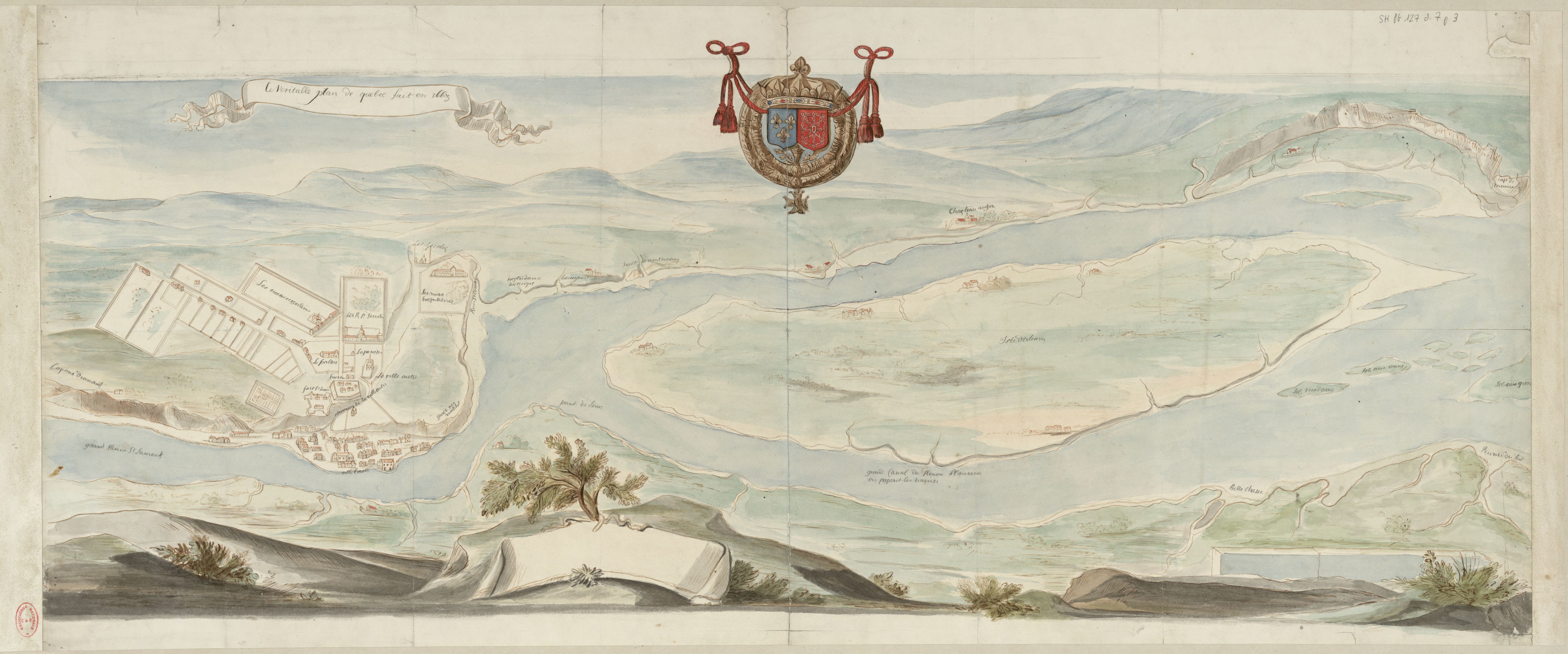 Québec est donc la principale habitation où réside le gouverneur général de tout le pays, il y a une bonne forteresse et une bonne garnison : comme aussi une belle église qui sert de paroisse et qui est comme la cathédrale de tout le pays : le service s’y fait avec les mêmes cérémonies que dans les meilleures paroisses de France ; c’est aussi dans ce lieu que réside l’évêque. Il y a un collège de jésuites, un monastère de Ursulines qui instruisent toutes les petites filles ce qui fait beaucoup de bien au pays ; Aussi bien que le collège des jésuites pour l’instruction de toute la jeunesse de ce pays naissant. Il y a pareillement un couvent des hospitalières, qui est un grand soulagement pour les pauvres malades. C’est dommage qu’elles n’ont davantage de revenus. Québec est situé sur le bord du grand fleuve Saint-Laurent, qui a environ une petite lieu de large en cet endroit-là, et qui coule entre 2 grandes terres élevées ; cette forteresse, les églises et les monastères, et les plus belles maisons, sont bâties sur le haut ; Plusieurs maisons et magasins sont bâtis au pied du coteau, sur le bord du grand fleuve, à l’occasion des navires qui viennent jusque-là ; car c’est là le terme de la navigation pour les navires ; On ne croit pas qu’il puisse passer plus avant sans risque.