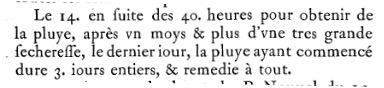 Le 14 juillet 1666, en suite des 40 heures pour obtenir de la pluie, après un mois et plus d’une très grande sécheresse, le dernier jour, la pluie ayant commencé dure 3 jours entiers et remédie à tout.[3]