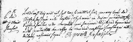 Le vingt trois avril mil sept cent soixante et six, par moi curé de Saint-Joseph soussigné a été baptisé Joseph Marie né le jour précédent, fils de Joseph Samson et de Marguerite Guay, son épouse légitime le parrain a été jean baptiste bourassa la marraine angélique samson qui ont déclaré ne savoir signer. Ch. youville Dufort, prêtre